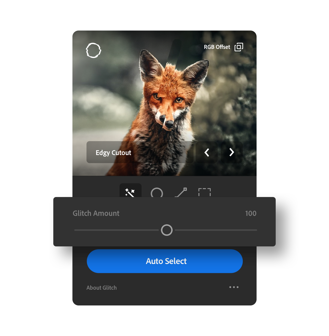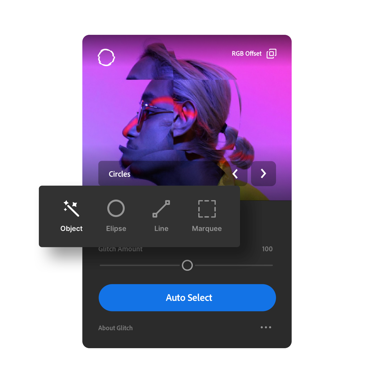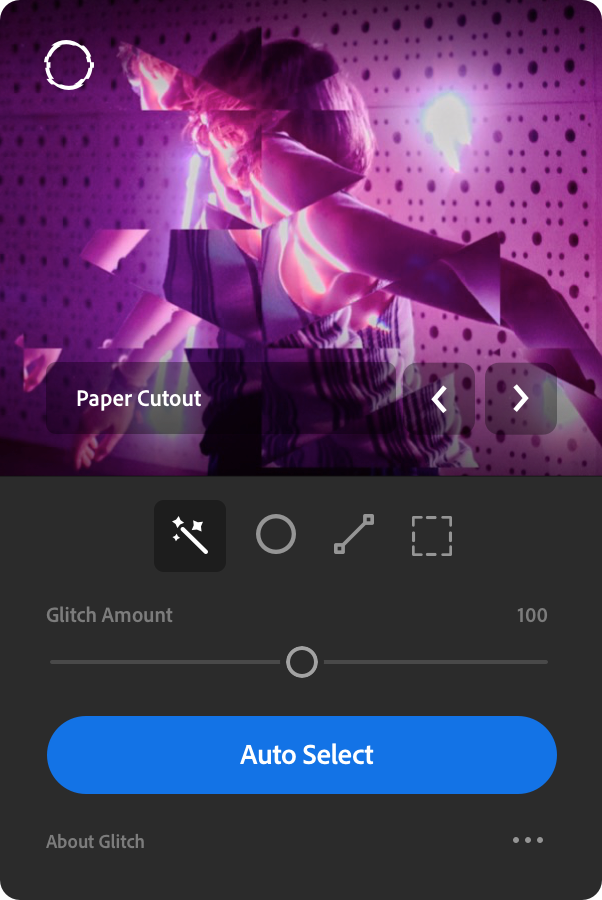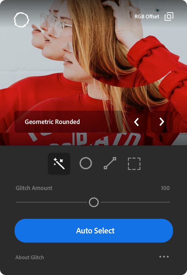 The glitch comes with 4 image selection modes to ensure you apply the effect to just the right spot. Auto object selection, line tool selection, marquee tool selection and ellipse tool selection modes, allow for fine-grain control over where the effect should be applied.