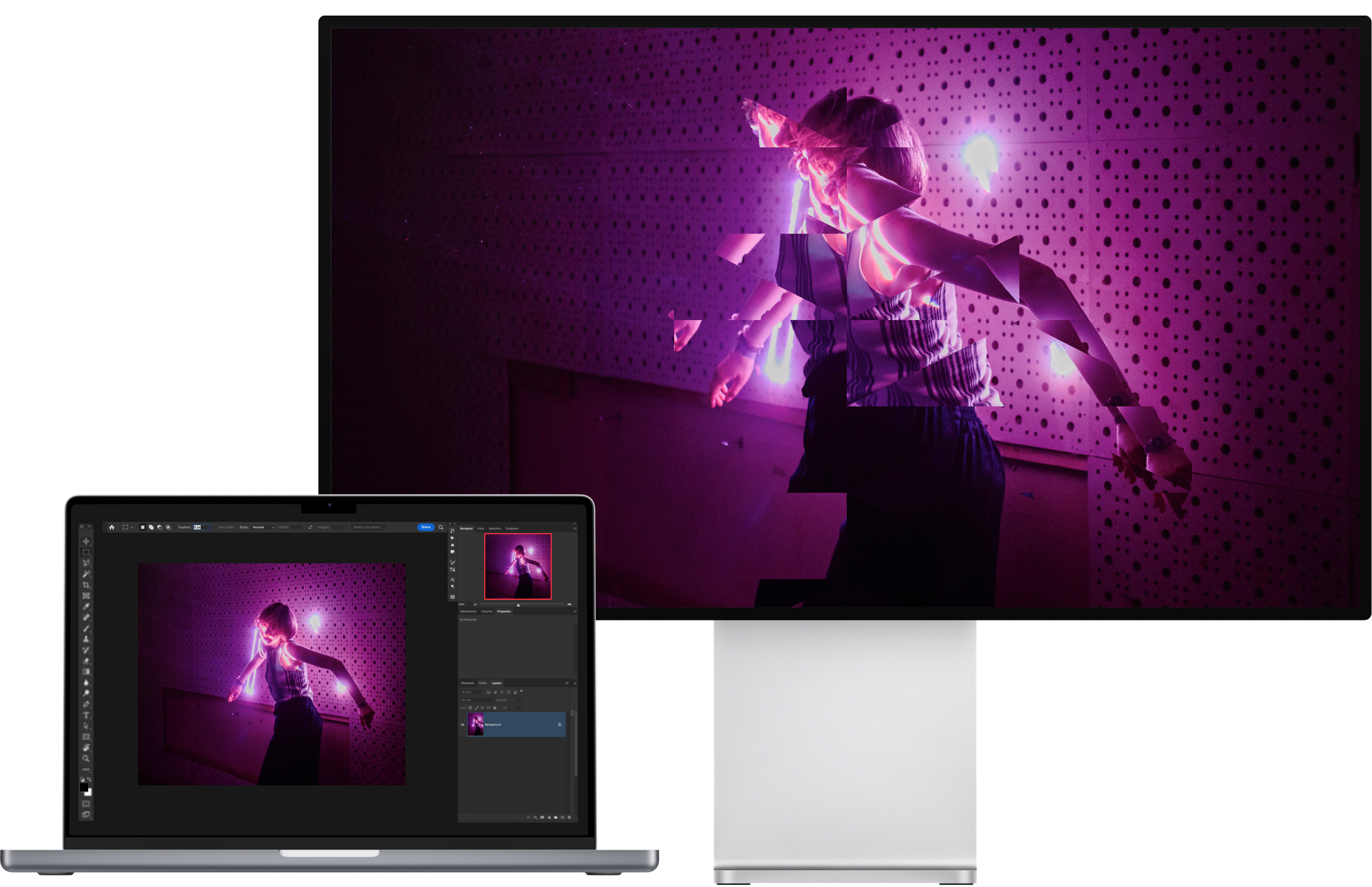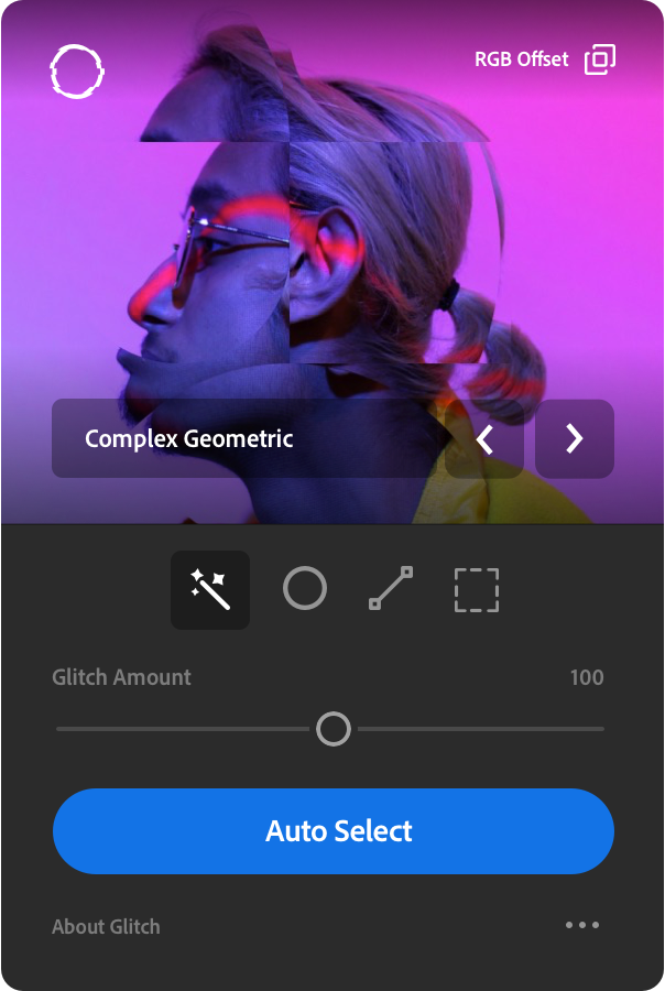 Leveraging Photoshop's inbuilt magic wand, Object Select, Glitch can auto select your objects and apply your selected effect to the object area, creating unique results, fast.