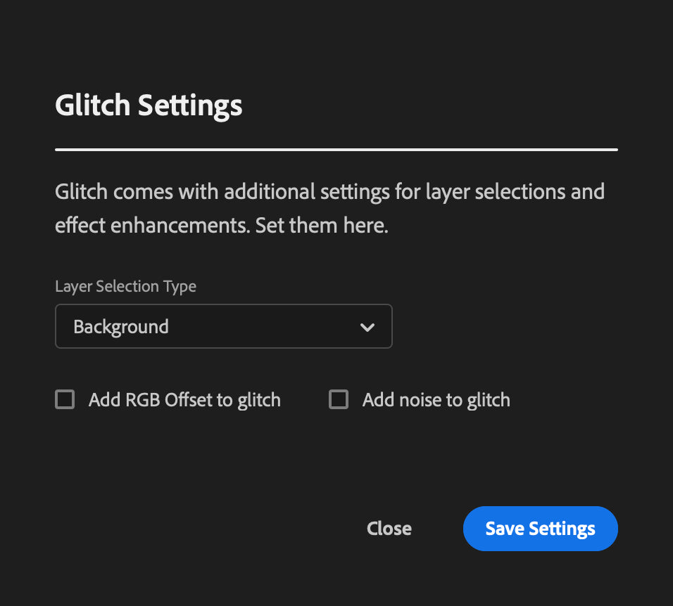 Glitch comes with additional settings for layer selections and effect enhancements. Add noise or RGB offsets to your images to further distort and glitch your images. Also included is the Active Layer selection mode, currently in Beta.
